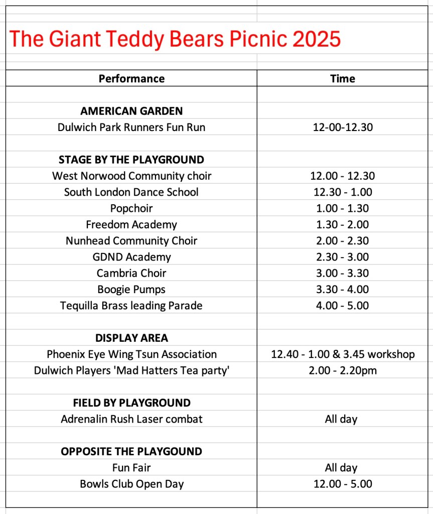 Bring your teddies, picnic rugs, families and friends and join us for a funfair, theatre show, local choirs, bands, dance acts and a parade beside the playground in Dulwich Park! A variety of food and drink stalls will tempt you too!
