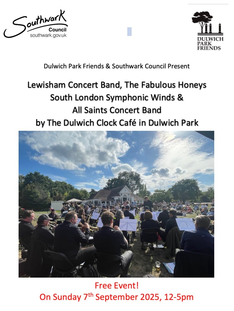Please join us, with a picnic or lunch and drinks from the cafe to enjoy the wonderful sounds of Lewisham Concert Band, The Fabulous Honeys, South London Symphonic Winds &